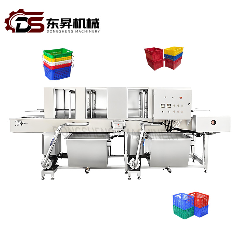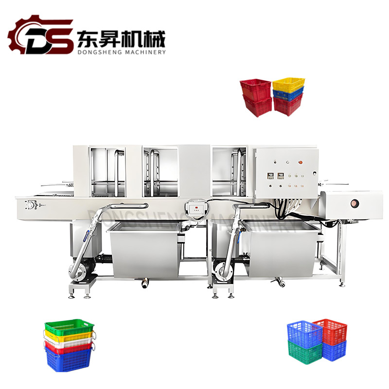 This Full-Automatic Basket Washer is a professional cleaning equipment designed for recycling baskets in vegetable processing, catering, and food distribution industries-mainly used to clean plastic or metal turnover baskets that hold vegetables, fruits, or food ingredients, removing residual dirt, vegetable dregs, oil stains, and bacteria. It realizes the whole-process automation of basket feeding, high-pressure cleaning, detergent rinsing, hot air drying, and discharging, completely replacing manual cleaning and greatly improving work efficiency.